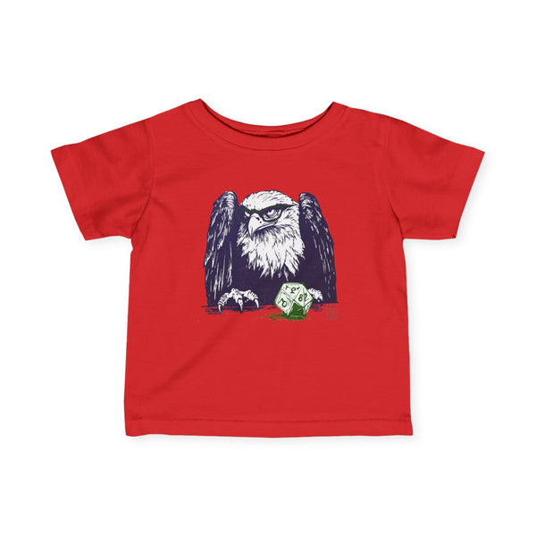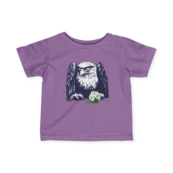 Let your little one spread their wings with this adorable eagle t-shirt! Featuring a stylish eagle wearing glasses and a Dungeons & Dragons dice by their side, this tee is perfect for tiny adventurers and future gamers. Made from soft, breathable cotton, it keeps them comfy whether they're taking a nap or embarking on their first adventure. Whether they’re exploring new worlds or just chilling, this shirt adds a fun, geeky flair to their wardrobe.