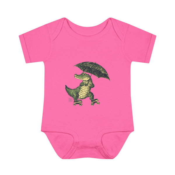 This gator’s got moves! Featuring a cheerful alligator rolling along with an umbrella, this onesie is perfect for little ones who are always on the go. Soft, breathable, and built for everyday fun—just like your tiny adventurer!
