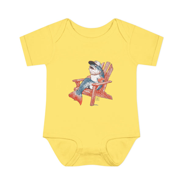 Start your baby’s chill lifestyle early with this cozy sea bass onesie! Featuring a fun fish kicking back in an Adirondack chair, this bodysuit is perfect for tiny adventurers who know the value of a good lounge. Soft, comfy, and made for relaxed vibes—just like your little one.