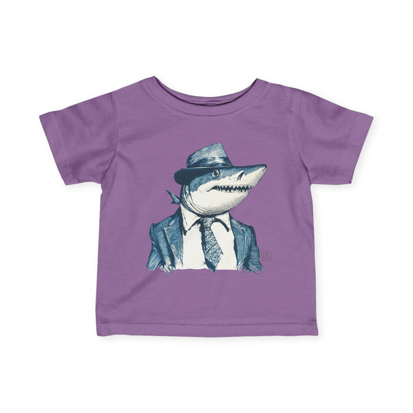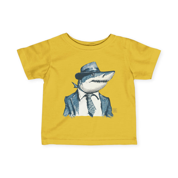 Let your little one start their journey to the top with this adorable shark t-shirt! Featuring a sharp shark dressed in a tie, jacket, and hat, this tee is perfect for future bosses in the making. Made from soft, breathable cotton, it keeps them comfy whether they're making waves or just hanging out. Whether they’re crawling or chillin’, this shirt adds a touch of business-savvy charm to their day.
